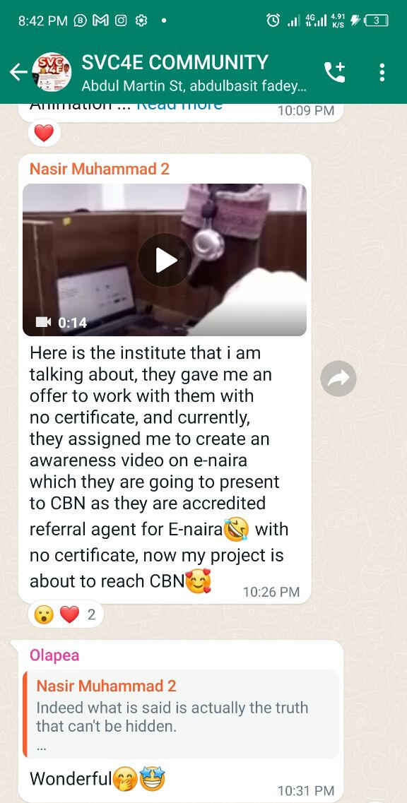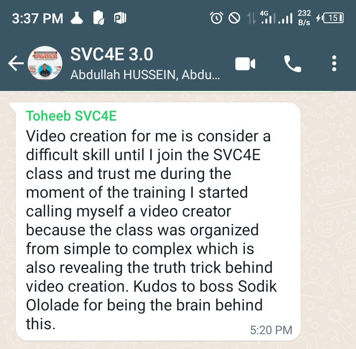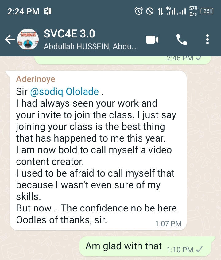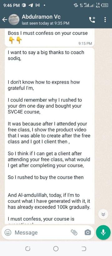 3οΈβ£ BUSINESS OF VIDEO CREATION AND VIDEO EDITINGThis is where you learn how to build a profitable online business with the video creation skill acquiredβ© FAST APPROACH TO SETUP YOUR PORTFOLIO IN 40 days or lessβ© How to position Yourself to attract paying clientsβ© OFFER CREATIONβ© New opportunities you can leverage on to make money as a Video ads Creator4οΈβ£ CLIENT ACQUISITION COURSESThis is where you get access to 2 different exclusive client acquisition courses by top expertsI will also share my IWC client acquisition strategy with you to learn the step by step approach I use to acquire clients that pays for my skill5οΈβ£ LIVE TRAININGS AND COACHING SESSIONSTop experts are invited to SVC4E community to teach the students how to improve, grow and make more money with their skillThe average Value of the 1Hour of the Coaches that will be teaching you is worth β¦50K and they give you that 2Hours Every WeekApproximately, that is β¦100K a weekNow, spread that over the period of 1 Month of 4Weeks.Let me help you with the maths, that's β¦400K Per Month.6οΈβ£ SVC4E LIBRARY AND RESOURCESFree access to SVC4E digital library where various creative videos by experts are been uploadedSo anytime you want to create videos, you can easily get videos ideas from videos in the Library and createThat's not all π€π€You will get Free access to top video creation and editing resources to help your video creation process easier without you having to waste time sourcing for video ideas
