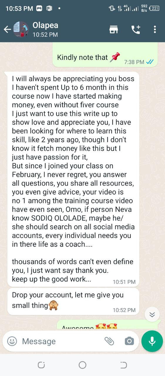 I have always wanted to make money being a student.I participated in various Ponzi schemes platforms (NNU, Pioneer, Newspay,blognaija)I tried all the possible approach I could use to make money but all turned abortive.Suddenly the Covid lockdown started, I had to return homeWhile I was at home, I was doing nothing profitableUntil an evening when I stumbled on a free WhatsApp classI joined the class and was introduced to different ways to make money legally with smartphone which video animation was among.There was a masterclass for video animation which was pegged at N3,000.I was damn broke, I couldn't afford to pay for the class, I had to borrow the money from my mom to sign up for the class3 weeks after the masterclass, I created a free intro video for a friend of mine whom owns a business.The video generated engagement which his partners also reached out to me to create such video for their business.I could remember I charged #2,000 to 3N,000 per video which I was able to earn N11,000 in less than 6 days.I was so happy, it was my first time making money online.Moving forward, I had to improve my knowledge which I pay for more classes.I practiced this skill and I was able to get a client that paid me #25,000 for a video project.I invested more of my time to learning this skill and started offering my skill as services to brand and companies.Now, I create and edit videos for brands and companies generating 6 figures monthly being a student with my video creation skill and my smartphone.Using this simple system I was able to generate 7 figures in less than 7 months selling my skill as a product and service