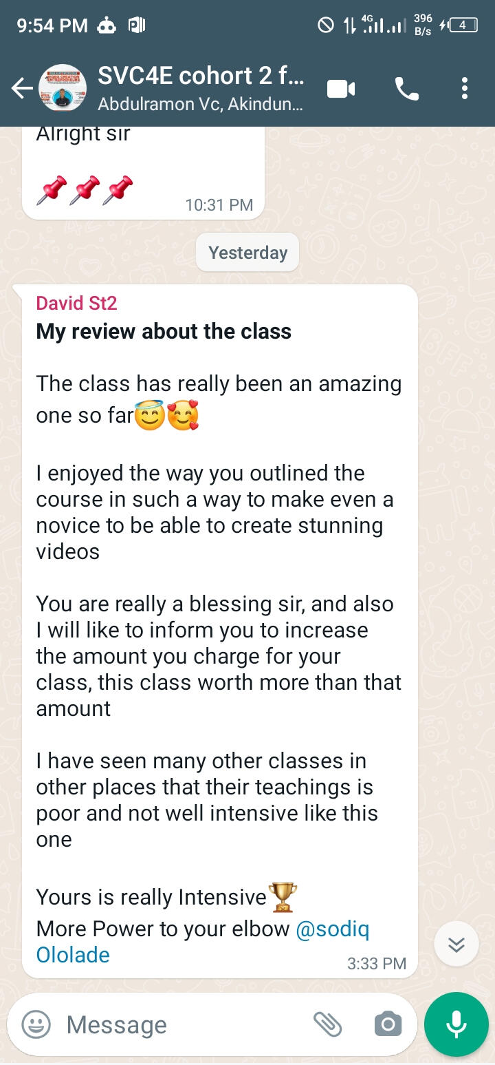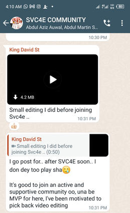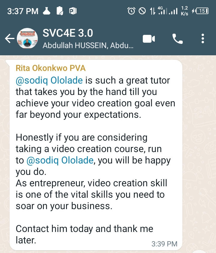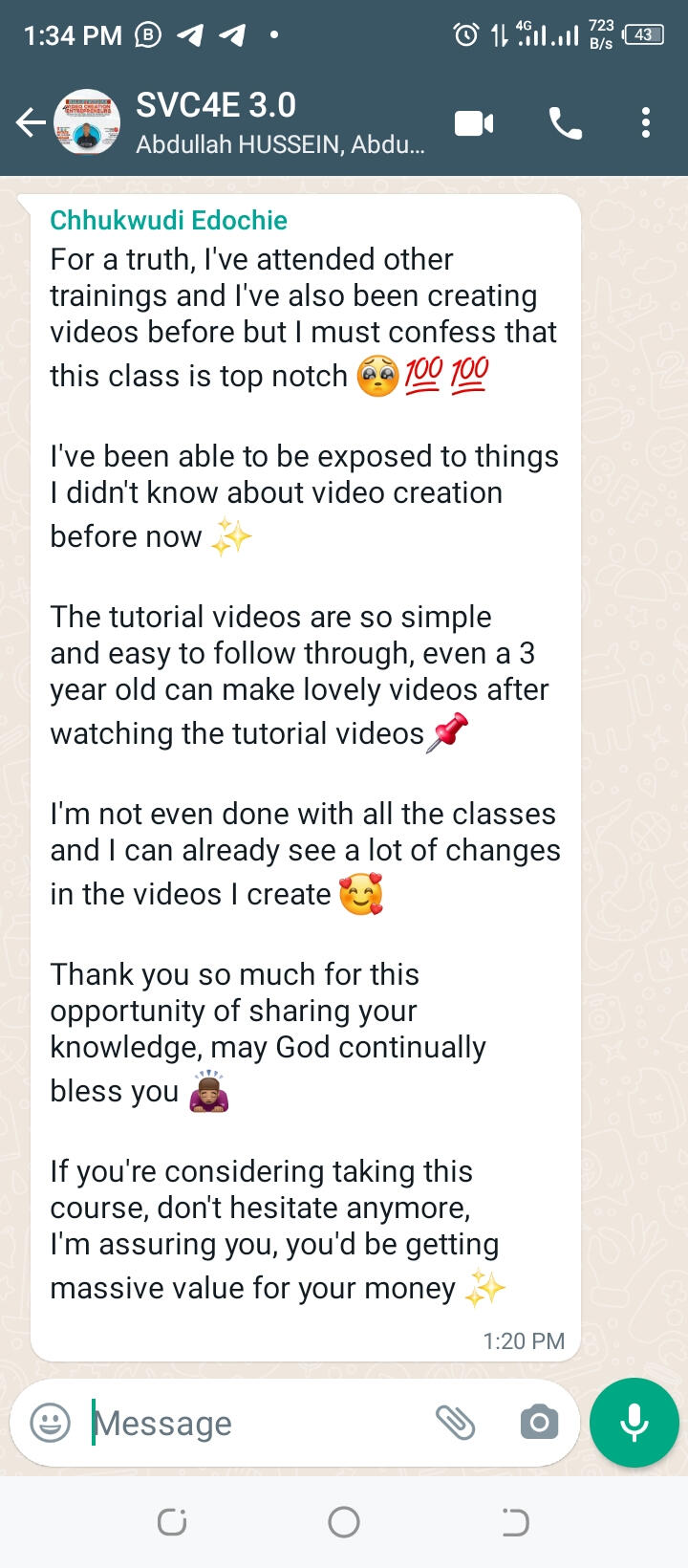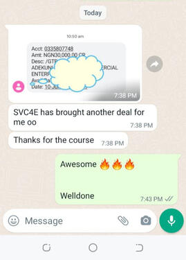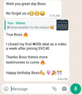 3οΈβ£ BUSINESS OF VIDEO CREATION AND VIDEO EDITINGThis is where you learn how to build a profitable online business with the video creation skill acquiredβ© FAST APPROACH TO SETUP YOUR PORTFOLIO IN 40 days or lessβ© How to position Yourself to attract paying clientsβ© OFFER CREATIONβ© New opportunities you can leverage on to make money as a Video ads Creator4οΈβ£ CLIENT ACQUISITION COURSESThis is where you get access to 2 different exclusive client acquisition courses by top expertsI will also share my IWC client acquisition strategy with you to learn the step by step approach I use to acquire clients that pays for my skill5οΈβ£ LIVE TRAININGS AND COACHING SESSIONSTop experts are invited to SVC4E community to teach the students how to improve, grow and make more money with their skillThe average Value of the 1Hour of the Coaches that will be teaching you is worth β¦50K and they give you that 2Hours Every WeekApproximately, that is β¦100K a weekNow, spread that over the period of 1 Month of 4Weeks.Let me help you with the maths, that's β¦400K Per Month.6οΈβ£ SVC4E LIBRARY AND RESOURCESFree access to SVC4E digital library where various creative videos by experts are been uploadedSo anytime you want to create videos, you can easily get videos ideas from videos in the Library and createThat's not all π€π€You will get Free access to top video creation and editing resources to help your video creation process easier without you having to waste time sourcing for video ideas