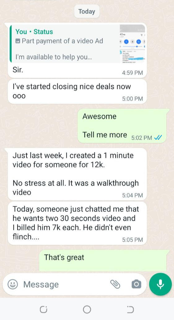 Bringing this to Africa ( Nigeria)You can get paid within 20k to 50k or more creating high converting videos for business esI charge and get paid not less than 30 to 50k for a minute videoNot that alone, my students has also do this countless timesLet me show you some of their winnings π